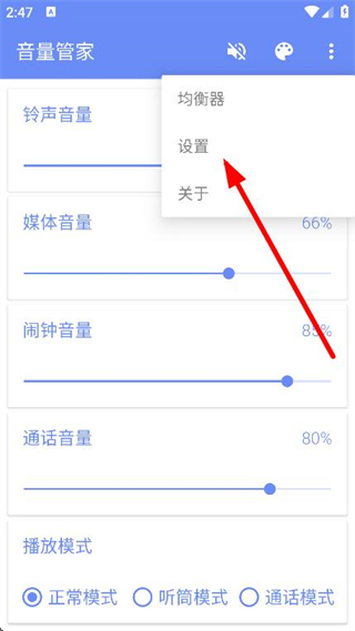 1、打开音量管家,点击右上角菜单按钮,展开功能选项。