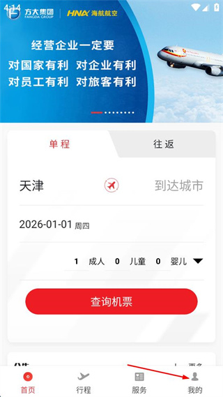 2、进入天津航空APP的首页,找到页面下方的我的选项,点击该选项进入个人中心页面。