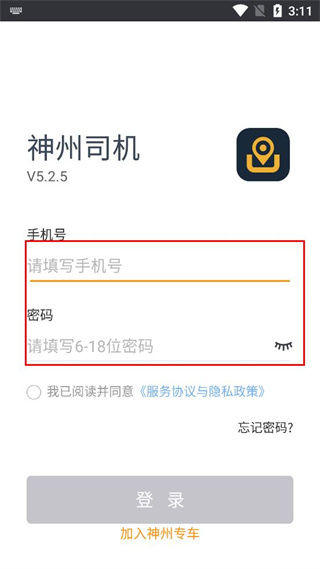 2、进入神州司机的登录页面,在手机号栏填写对应的号码,在密码栏填写6-18位的密码。