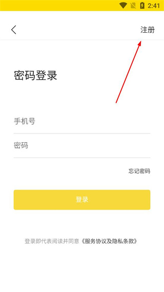 1、进入密码登录页面,找到页面右上角的注册按钮,点击该按钮进入注册页面。