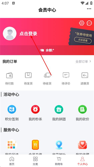 2、在会员中心页面,点击点击登录选项,弹出您还未登录的提示框。