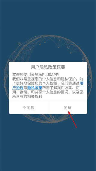 1、打开爱贝乐PLUSAPP,看到用户隐私政策概要弹窗,点击同意按钮。