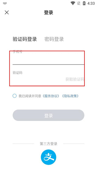 3、在登录界面选择验证码登录方式,依次填写手机号栏目的内容,以及对应的验证码。