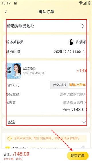 2、在美容师详情页面,点击目标项目旁的去预约按钮,可进入确认订单页面。
