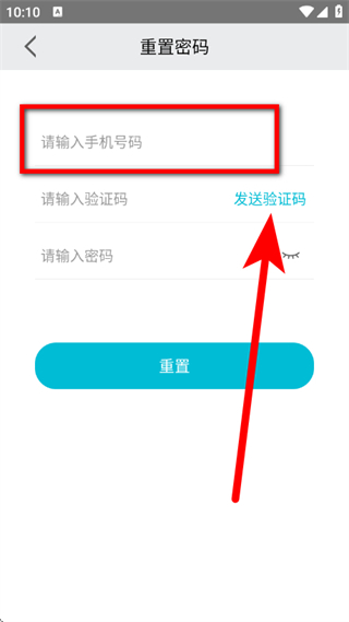 2、在重置密码页面,输入手机号码,点击发送验证码。