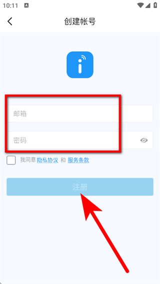 4、在创建帐号页面,填写邮箱、设置密码,勾选后,点击注册,完成账号创建。