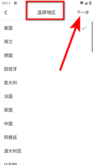 3、在选择地区页面,挑选对应的地区,点击下一步。