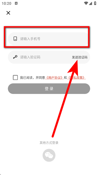 3、在登录页面,输入手机号,点击发送验证码。