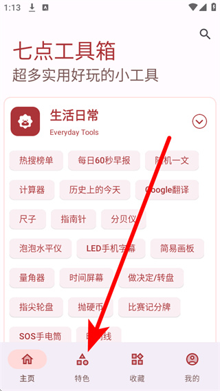 1、打开七点工具箱,点击底部导航栏的特色选项,进入特色工具页面。
