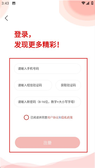 4、在注册页面,填写信息并勾选协议后,点击注册按钮即可完成账号注册。
