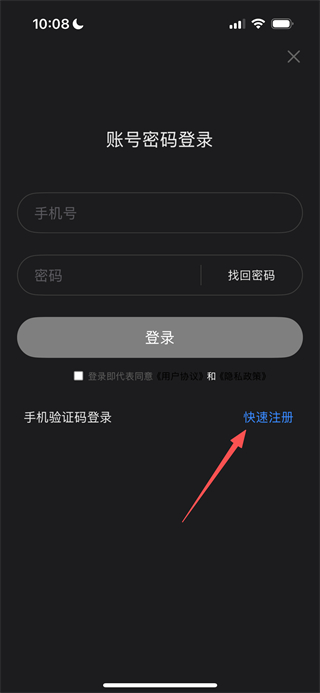 3、在登录页面,点击快速注册选项,可进入注册页面。