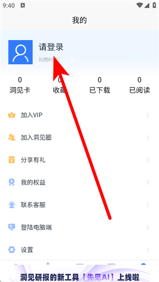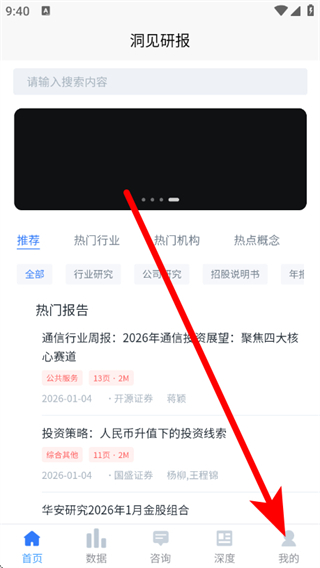 1、在洞见研报首页,点击底部我的,进入个人页面。