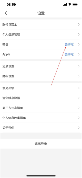 3、在设置页面点击微信选项,右侧的去绑定,完成微信绑定。
