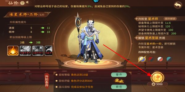 4、仙阶界面满足升阶条件后,点击升阶按钮提升职业等级,解锁更高属性与新外观等奖励。
