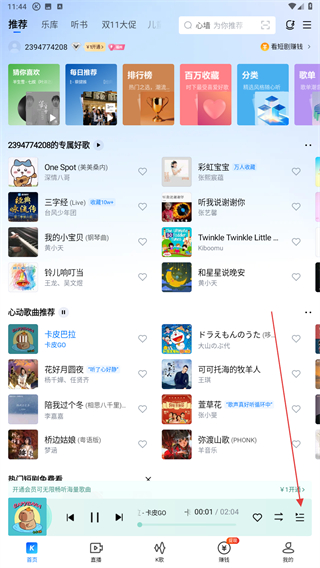 1、打开酷狗的APP,在首页点击要播放的歌曲。