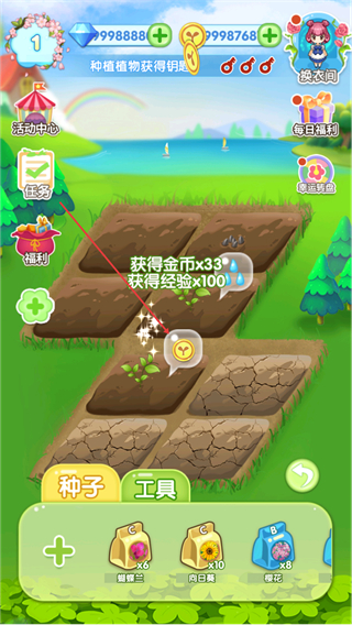 1、无限钻石自由支配,无需刷任务、等奖励,可直接购买全品类稀有种子、生长加速道具,还能解锁高概率服饰召唤特权,大幅降低养成门槛,专注享受核心玩法乐趣。