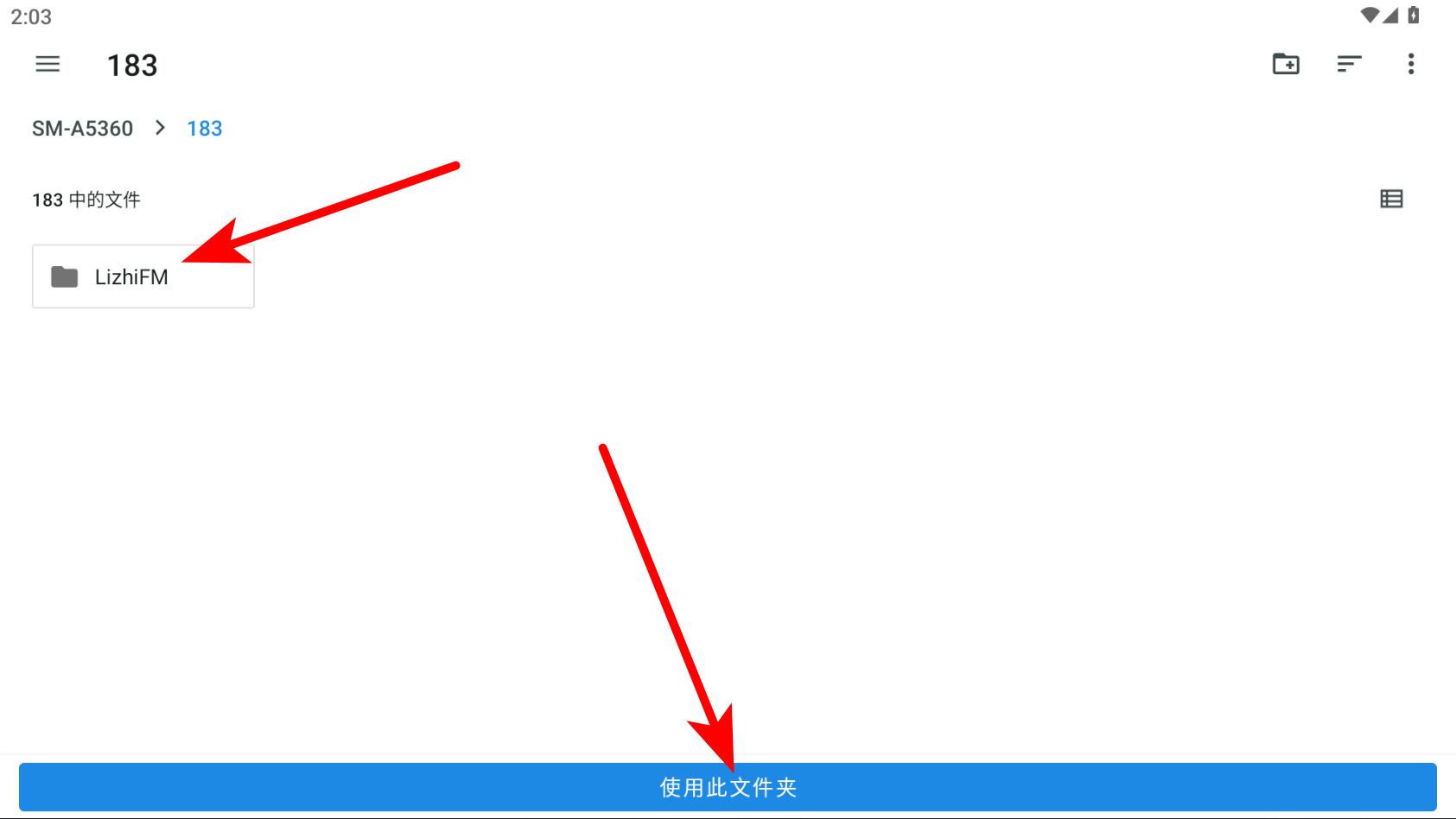 2、在文件夹选择页面,点击选择文件夹按钮,进入手机文件目录。