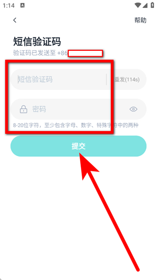 4、在短信验证码页面,输入验证码与密码,点击提交,完成注册。