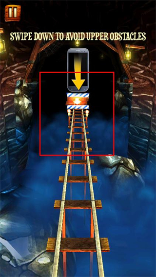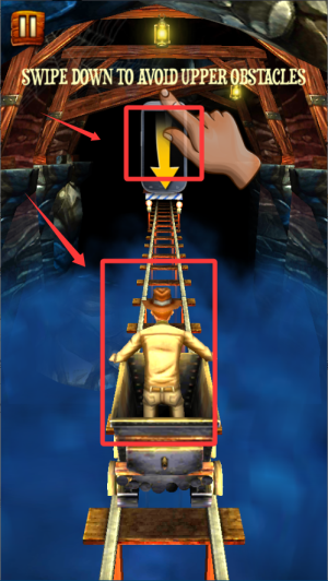 3、遇到上方障碍时,向下滑动屏幕,让矿车俯身躲避障碍。