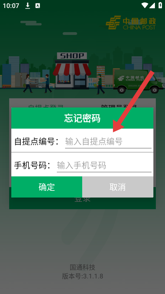 2、若是弹出框显示自提点的编号,输入自提点编号和绑定手机号,按照提示填写信息后点击确定。