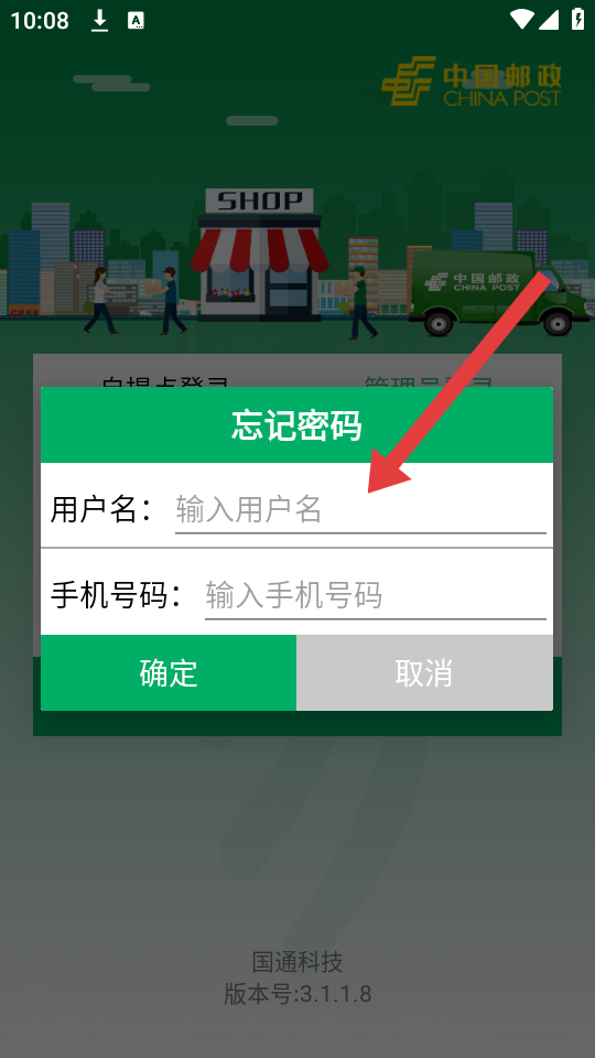 1、打开中邮e通的app,进入自提点的登录页面,这边我们点击忘记密码,启动密码找回流程。