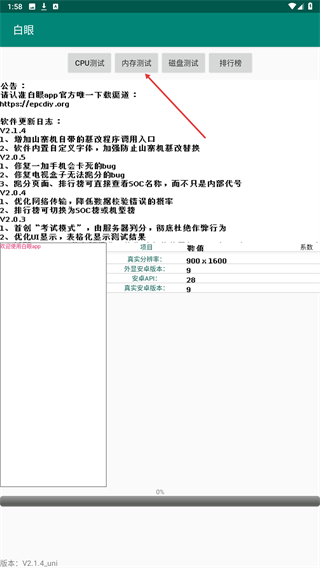 1、启动白眼app,进入时点击上方内存测试的按钮。