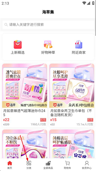 1、进入海草集后,点击底部的分类选项,可进入商品分类页面。