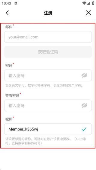 3、填写邮箱、获取并输入验证码、设置密码、填写昵称,提交即可完成注册。
