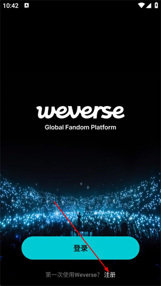 1、在Weverse启动界面,点击注册选项,进入注册方式选择页面。