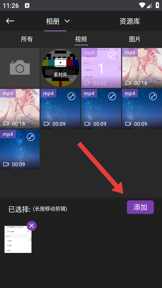 4、在页面需要选取视频素材点击添加,即可进行后续的视频编辑操作。