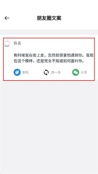 3、查看展示的文案内容,可通过复制-换一条-分享等,对文案进行对应操作。