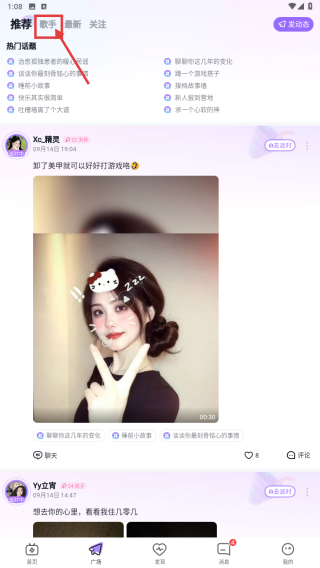 2、在广场页面,点击顶部歌手分类标签,查看歌手相关动态内容。