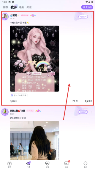 1、打开社交应用,点击底部广场选项,进入广场内容页面。