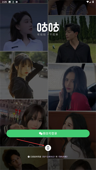 1、启动咕咕语音APP,进入时点击下方手机的图标。
