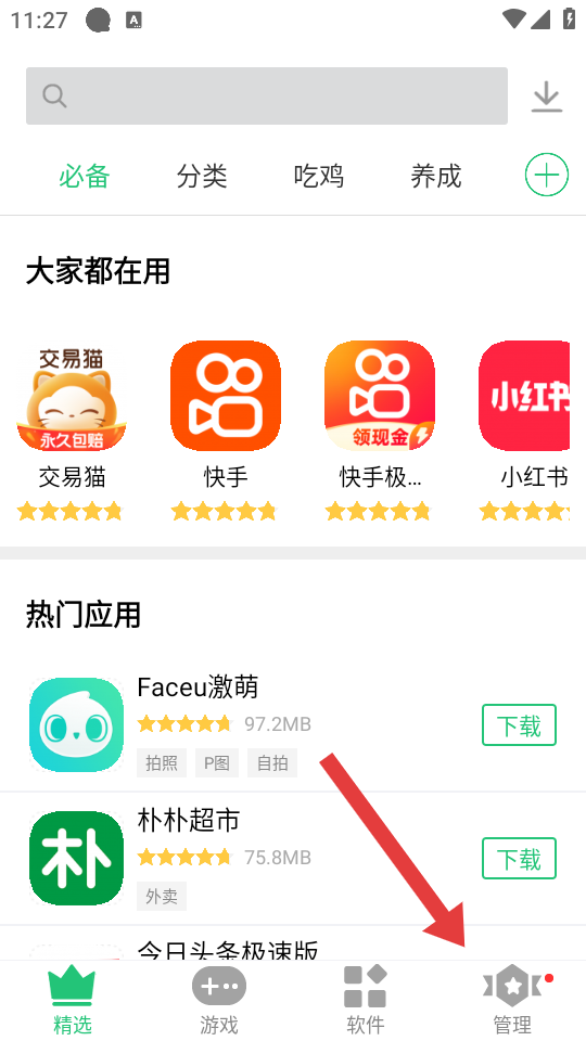 1、进入应用界面后,找到底部导航栏的管理选项并点击,进入对应功能页面以进行后续操作。
