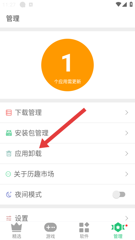 2、在管理页面,点击应用卸载的选项,进入应用卸载列表页。