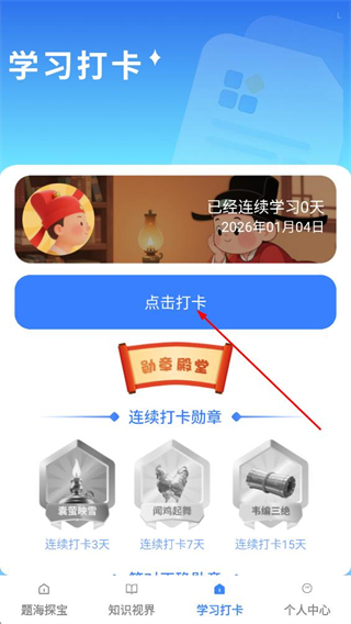 3、在学习打卡页面,点击点击打卡按钮,即可完成当日的学习打卡操作。