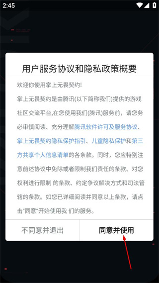 1、打开掌上无畏契约,查看弹出的用户服务协议和隐私政策概要,点击同意并使用按钮。