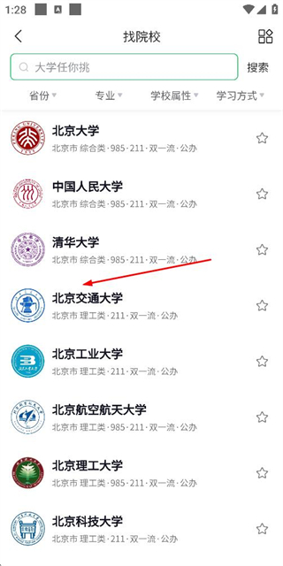 3、在找院校页面点击北京交通大学条目,进入北京交通大学的详情页面。