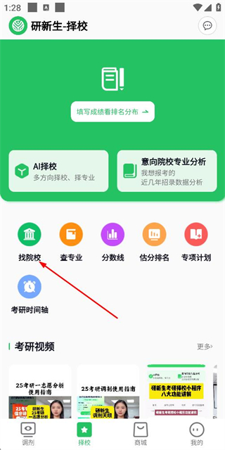 2、在择校页面点击找院校选项,进入找院校的列表页面。