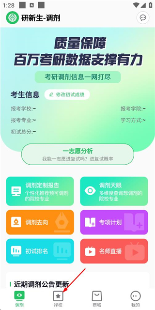 1、在调剂页面点击底部的择校选项,进入择校页面。