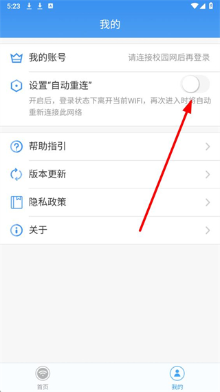 2、在我的页面中,找到设置自动重连选项,其开关当前处于开启状态。