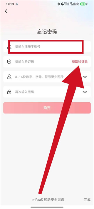 5、将收到的短信验证码填入对应栏,再设置符合要求的新密码,最后点击确定完成密码找回。