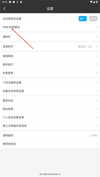 3、在设置的页面内,点击字体/阅读模式的按钮。