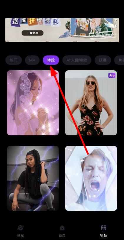 2、在模板页面,点击上方的特效分类标签,浏览各种特效模板。