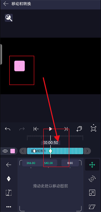 4、紧接着,将圆角矩形也移动到需要的地方,继续设置结束关键帧;