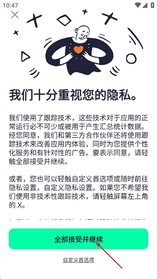 1、点击界面右上角的账户图标,触发隐私提示弹窗,选择全部接受并继续按钮。