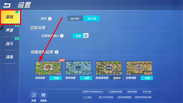 3、在设置界面的基础分类下,找到地图皮肤设置板块,查看可选的地图皮肤选项。