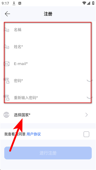 3、点击选择国家选项,在国家列表中选择目标国家,然后点击完成返回注册页面。