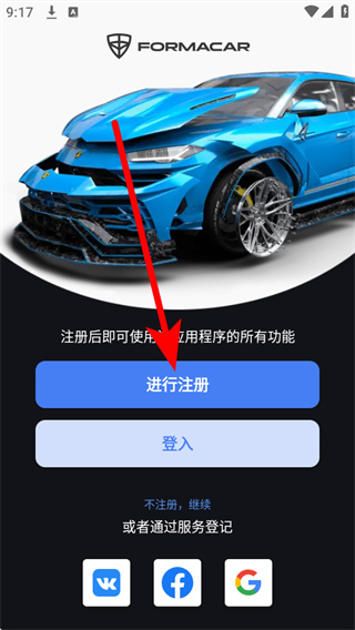 1、打开formacar,在初始页面点击进行注册,进入账号注册页面。